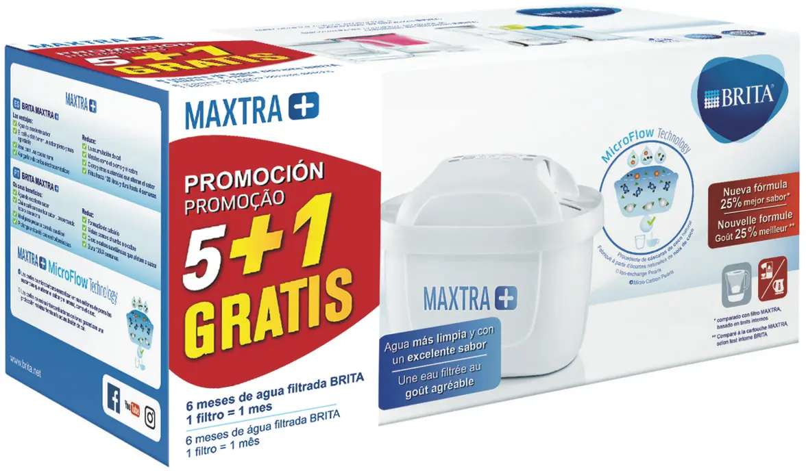 Conjunto de 5+1 filtros MicroFlow de MAXTRA+, garantizan una filtración de agua mucho más potente para bebidas calientes, frías y para cocinar.